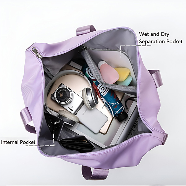 Diese tasche verfügt über eine nass- und trockentrennwand zur praktischen aufbewahrung von schmutziger oder nasser kleidung und handtüchern.