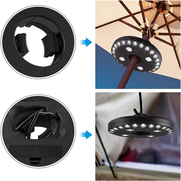 Im Gegensatz zu herkömmlichen Schirmlichtern funktioniert BRELLAGLO überall dort, wo Sie es benötigen. Klemmen Sie es an einen Schirm für Terrassenbeleuchtung oder verwenden Sie die integrierten Haken zum Aufhängen—ideal für Camping und Outdoor-Abenteuer.